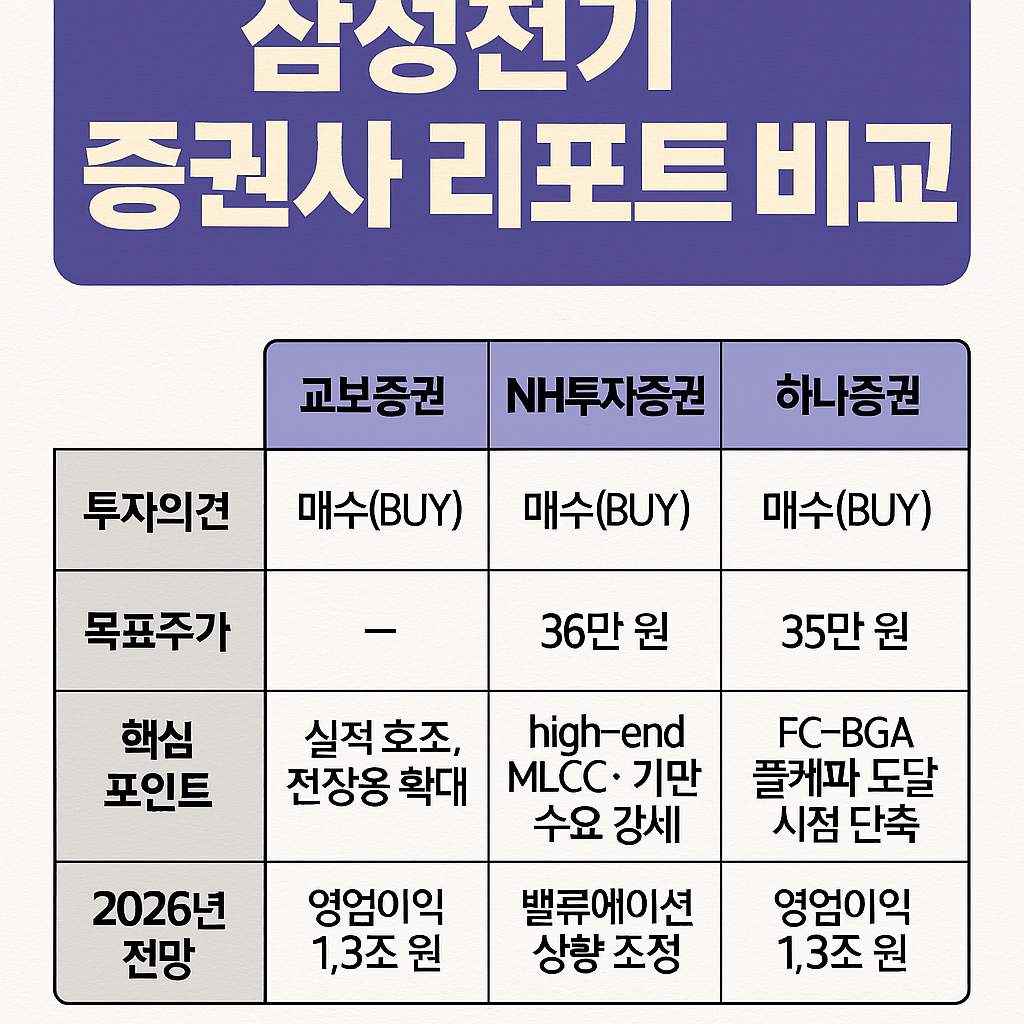 2026년 삼성전기는 고부가 MLCC와 FC-BGA 기판을 중심으로 실적 개선세를 이어갈 것으로 보입니다. 투자자 입장에서는 증권사들의 긍정적인 전망을 참고해 전략을 세워볼 수 있는 시점입니다.